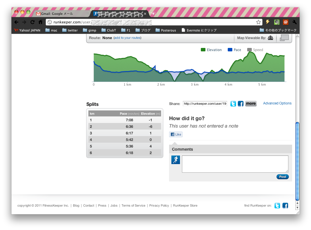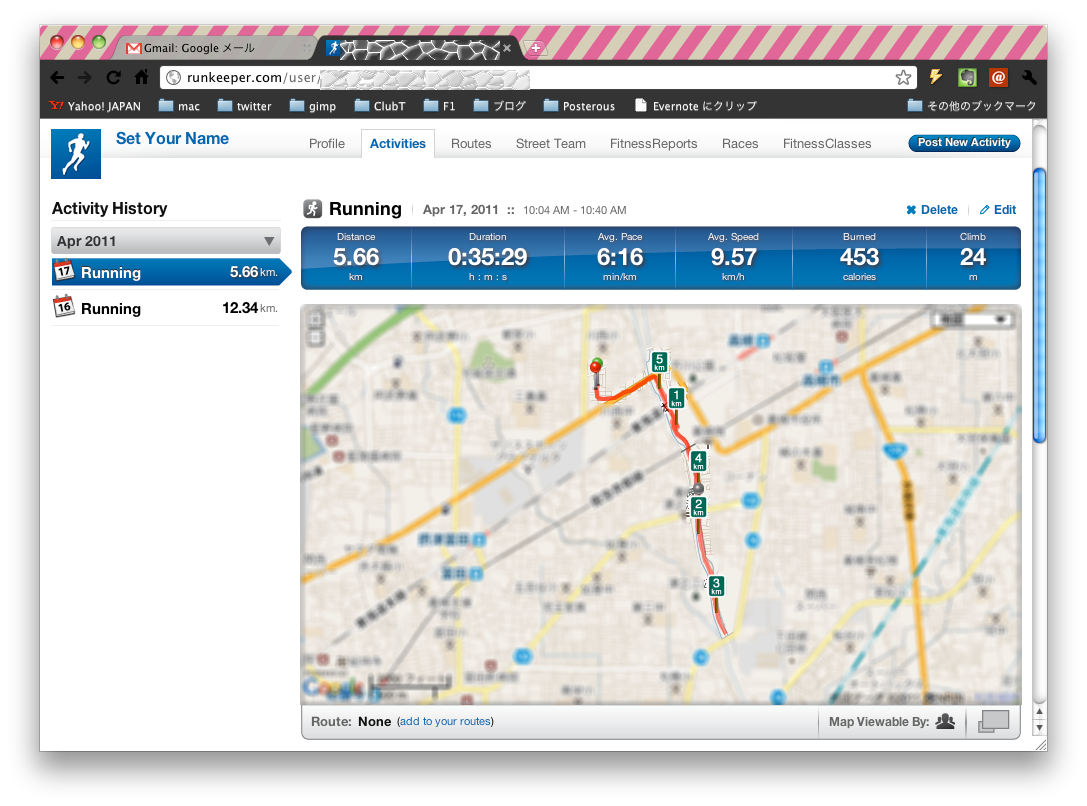 なぜここまで細かく分かるかというと,RunKeeperというiPhoneアプリを使ったから。アカウント作ればWebでも管理できます。