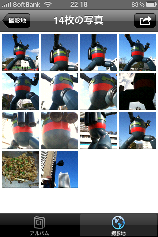 ピンをタップするとその撮影地の写真枚数が表示され,さらに矢印をタップすると写真一覧が表示されます。