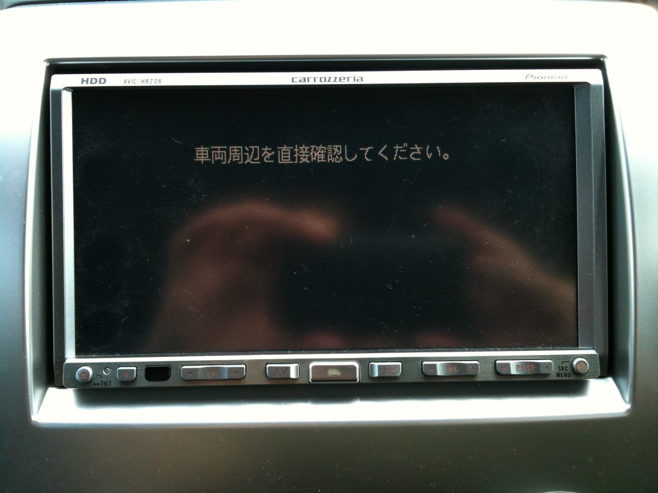 ギアをリバースに入れても,こんな感じで画面真っ黒(何か映ってるように見えるのは,真っ黒の画面に反射した僕の手です)。