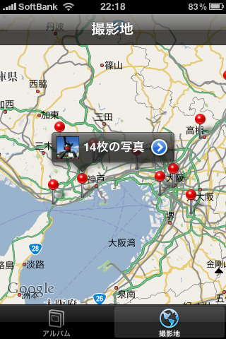 ピンをタップするとその撮影地の写真枚数が表示され,さらに矢印をタップすると写真一覧が表示されます。