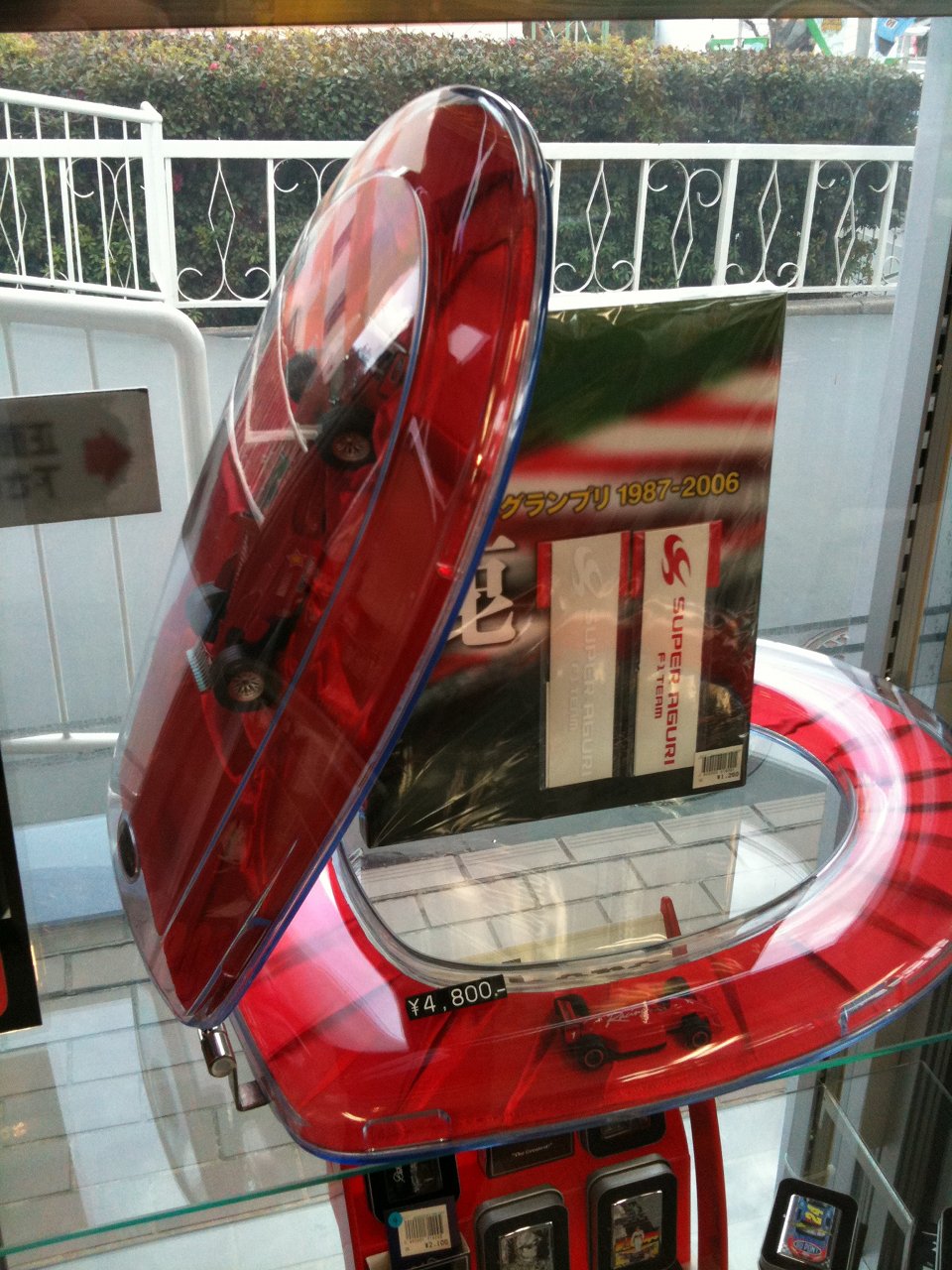 フェラーリ風の便座。4800円。意外に安くてもうちょっとで買うところやった。よく見ると中に入ってるマシンは全然フェラーリじゃないんだけどね。